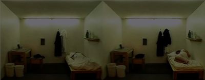 The second thing I like about this work is its minimalism. Not only because of the symmetrical composition, the lighting, the way the clothes are hung over the pegs on the far wall.