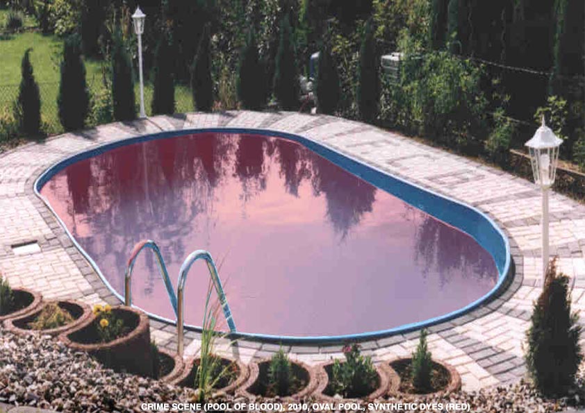 CRIME SCENE (POOL OF BLOOD), 2010, OVAL POOL, SYNTHETIC DYES (RED) found image/photoshop
