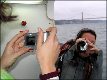 We zaten op een boot en die bracht ons naar de andere kant van de rivier en daar aten we vis. Ik ben helemaal niet zo fishy, maar er werd gezegd dat als je in Lissabon bent, je op z'n minst een keer vis moet eten in zo'n door TL-balken verlicht eethuis waar de Portugezen ook gewoon eten. Het was tof in het door TL-balken verlichte eethuis en die vissen waren best te doen. Het was goed om uit eten te gaan, want de avond daarvoor lag ik nog in mijn hotelkamer vre-se-lijk zielig te wezen want ziek & koorts & belabberd. Ziek zijn op reis is geen onverdeeld succes kan ik u melden. Snothoofden in vliegtuigen zijn ook geen goede combinatie. Dus ik was blij dat ik het helemaal naar de overkant had gehaald en eindelijk de dingen deed die je hoort te doen als je op vakantie bent. Ook leuk voor mijn reisgezelschap, dat mij voor de verandering eens zónder heftig zakdoek- en neusdruppelgebruik kon meemaken. Zoals uit de foto blijkt is alles vastgelegd. Dat kun je aan ons wel overlaten, vastleggen. Wij zijn van het vastleggerige soort. Maar dat zijn eigenlijk alleen maar foto's die ook her & der op het www te vinden zijn als u Lissabon op Google intypt. Rode daken, wasgoed in steegjes, een kasteel hier en daar en maar weer eens een terras. Andere foto's zijn voor intern vermaak. Jammer joh. Morgen wel een debiele Digi vd Dag, die dan dus even niet van Die Dag is. Morgen. Beloofd. Eerst slapen en gewoon weer werken.