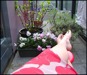 Na een lange slaap, zeg maar gerust coma maar dan met fijne dromen, scheen de zon. Ik testte mijn gemeenschappelijke tuin, deed huishoudelijks, hing wasgoed in de zon te drogen, ruimde kamers op, liet de kat voor het eerst naar buiten, sorteerde post en wisselde dat alles heel wijs af met een mini-vakantie op mijn warme balkon. En voor wie geïnteresseerd is in de transformatie van jongetje in meisje: ik had een rokje aan vandaag.