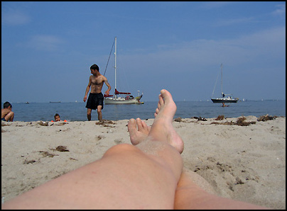 De kinderen zouden een dag weg gaan. Naar hun vers aangekomen Nieuw-Zeelandse opa & oma en ik ging niet mee. Ik mocht een Dag Alleen. Daar was ik gisterenavond al zo blij mee dat ik vannacht slecht sliep en veel te laat wakker werd. So far voor deel-I van de Dag Alleen. Het was plakkerig warm aan het strand, maar het water was met die blote borsten natuurlijk helemaal geen optie. Zelfs het slanke meisje naast me deed haar bovenstukje aan voordat ze ging zwemmen. Ik las stug door, en probeerde nergens meer op te letten. In het boek ging het steeds slechter met de hoofdfiguur en ik moest steeds harder lachen om al die neerslachtigheid. Ik weet niet wat het is met die boeken van Thomas V. Ze zijn echt niet vrolijk, mensen voelen zich over het algemeen of woedend of depressief of alles tegelijk, maar toch moet ik lachen. Ik zie de hoofdfiguur steeds voor me, zie ook wat zijn tegenspelers doen en denk dan vaak: dat ken ik. Dat zal het zijn. Inmiddels zag ik mezelf ook ineens zitten, half bloot in het zand, hardop lachend om een boek, en besloot dat het tijd werd voor een koffie in de strandtent. Een eindje verderop speelde een radio een nummer van Fergal Sharky. Was dat niet die man die ook echt op een haai leek? In de strandtent was het rustig, mensen waren druk in de weer met voedsel en rosé en er strompelde een klein kindje dat net had leren lopen. Toen de kletsnatte hond voor de tweede keer onder mijn rokje dook vond ik het wel genoeg. Op weg naar huis vroeg een jongen of hier ook een tram reed. Oh, jij woont hier! zei hij jaloers. Ja, ik woon hier en nu wil ik naar huis en het zou fijn zijn als er dan iemand was die mijn stijve nek even loswrikte. Ik moet meer oefening in die Dagen Alleen.