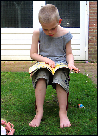 Groot ![]() Af en toe vergeet ik het gewoon. Hoe groot hij al is. Dat hij niet meer alleen maar rondrent in de tuin en met waterballonnen gooit. Maar dat hij als hij moe is op een stoeltje in de zon gaat zitten lezen. Heel zachtjes hardop en heel geconcentreerd, terwijl zijn nichtjes en verder binnenvallend kindergespuis om hem heen woest geluid en beweging produceren. Ik had al een grote zoon van 10, maar ik heb nu ook een grote zoon van 7. Die van lezen houdt. Goed man. ![]() Zoek: |