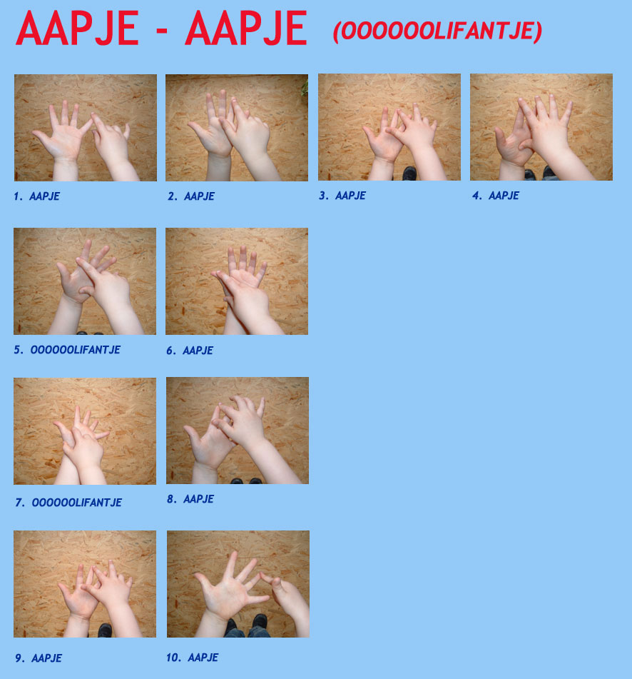 Aapjes en Olifantjes Verwarring alom. Hoeveel vingers en wanneer. En hoeveel aapjes en olifantjes. Hier hoe ik het ooit geleerd heb. En hoe ik het ook weer doorgeef. Wie weet hoe Aapje-Aapje er over 50 jaar uitziet. Aapje-Aapje-Aapje-Aapje-Oooooolifantje-Aapje-Oooooolifantje-Aapje-Aapje-Aapje (Met dank aan Kind-II, die het wel even wilde voordoen. Het regende toch.)