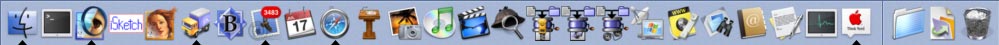 Finder | Terminal | Photoshop | iSketch (does anyone have a better idea) | Illustrator | Transmit | BBEdit | Mail | iCal | Safari | Keynote | iPhoto | iTunes | iMovie | Sherlock (never use it though) | 3 Stuffing things | Remote Desktop Connection | Internet Connect | Apple Remote Desktop | Address Book | Textedit | Activity Monitor | Slashdock | Shortcut to Applescripts | Filemaker Startup file | Trash
